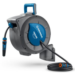 GRINDA HRA-20, шланг 20м x 1/2″, на поворотном кронштейне настенная, поливочный набор 4 предмета, катушка автоматическая со шлангом ProLine (428470)