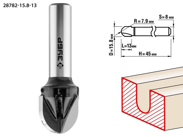 ЗУБР 15.8 x 13 мм, радиус 7.9 мм, фреза пазовая галтельная, Профессионал (28782-15.8-13)
