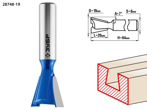 ЗУБР 19 x 20 мм, угол 7°, фреза пазовая фасонная ″Ласточкин Хвост″, Профессионал (28748-19)
