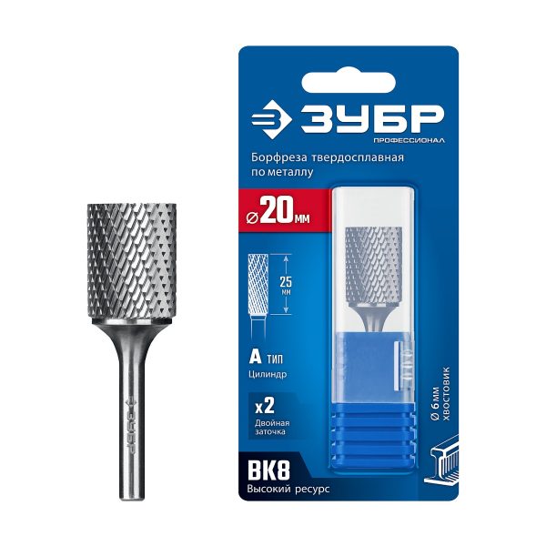 ЗУБР 20х25 мм, тип А (цилиндр с гладким торцом), хв-к 6 мм, твердосплавная борфреза, ПРОФЕССИОНАЛ (28800-20-25)