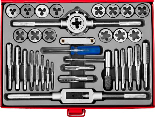 Набор предназначен для резьбонарезных работ в конструкциях и заготовках из сталей и цветных металлов. Метчики ручные однопроходные используются для нарезания внутренней метрической резьбы с нормальным и мелким шагом в глухих и сквозных отверстиях. Метчик трубный предназначен для нарезания внутренней трубной резьбы. Плашки предназначены для нарезания внешней метрической резьбы с нормальным и мелким шагом. Плашка трубная используется для нарезания трубной резьбы Метчикодержатель предназначен для надежного закрепления метчиков Плашкодержатель используется для закрепления плашек при проведении резьбонарезных работ
