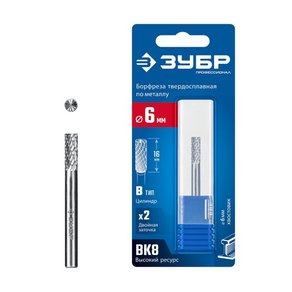 ЗУБР 6х16 мм, тив B (цилиндр с торцевыми зубьями), хв-к 6 мм, твердосплавная борфреза, ПРОФЕССИОНАЛ (28801-6-16)