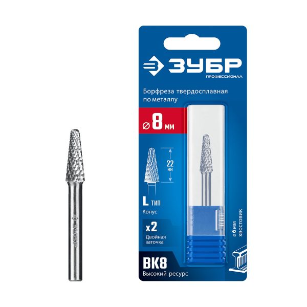 ЗУБР 8х22 мм, тип L (конус с закругленным углом 28°, радиус 1.4 мм), хв-к 6 мм, твердосплавная борфреза, ПРОФЕССИОНАЛ (28810-8-22)