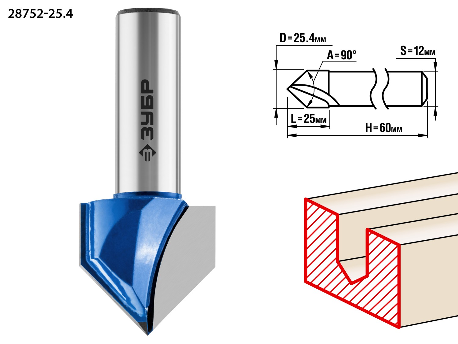 ЗУБР 9.5 x 9.5 мм, угол 90° мм, фреза пазовая галтельная V-образная, Профессионал (28752-9.5)