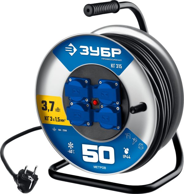ЗУБР КГ-315, КГ, 3 x 1.5 мм2, 50 м, 3700 Вт, IP44, силовой удлинитель на стальной катушке, Профессионал (55080-50)