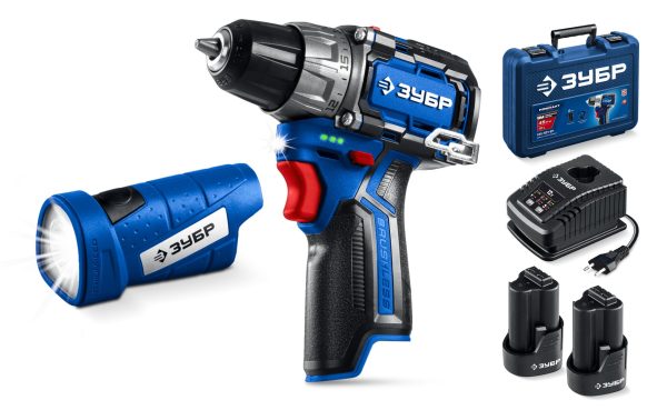 ЗУБР КОМПАКТ #4, набор: дрель-шуруповерт + LED фонарь, BRUSHLESS, 12 В, 45 Н·м, 2 АКБ тип Т7 (2 А·ч), кейс, Профессионал (DB-121-22F)
